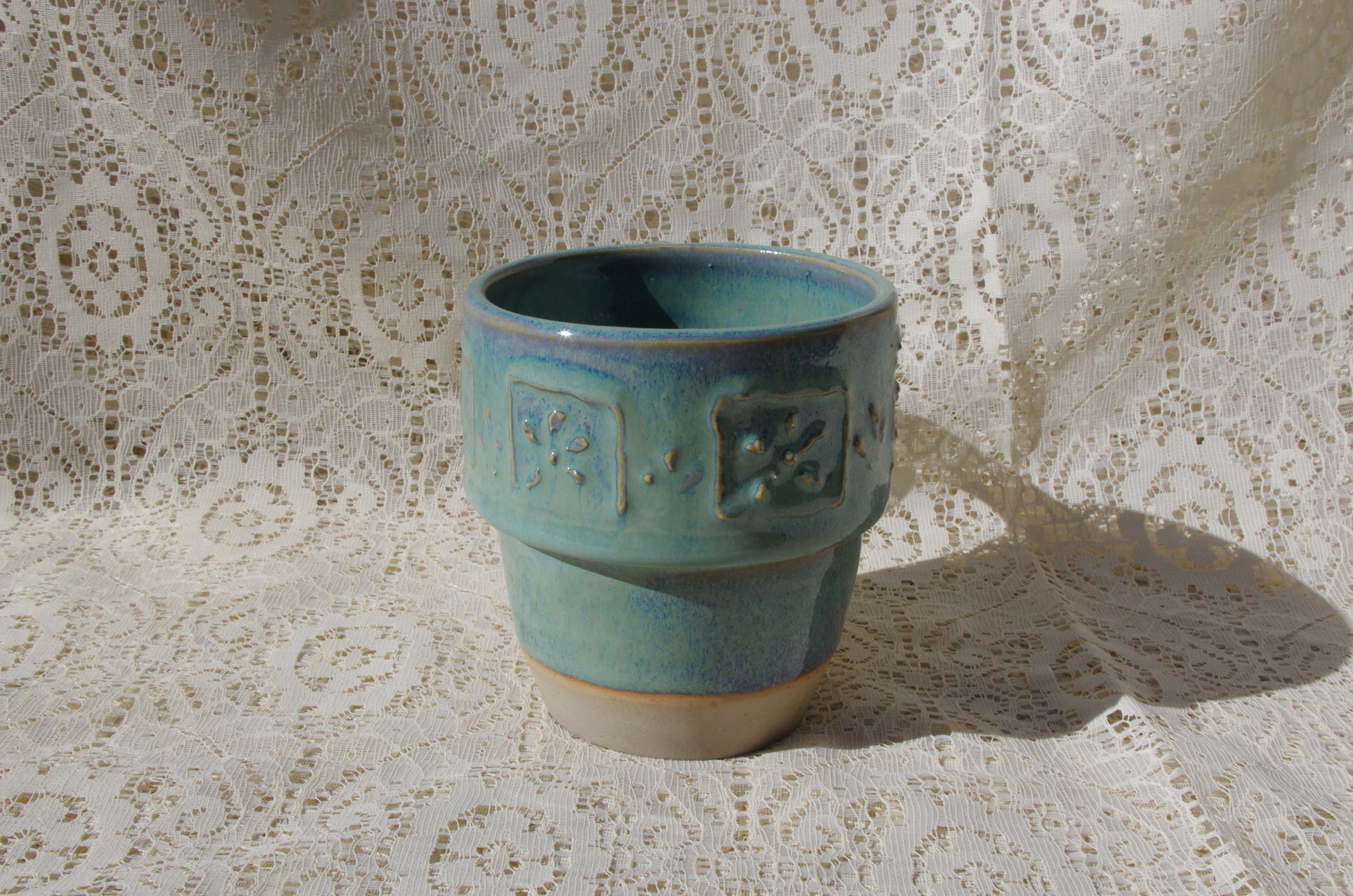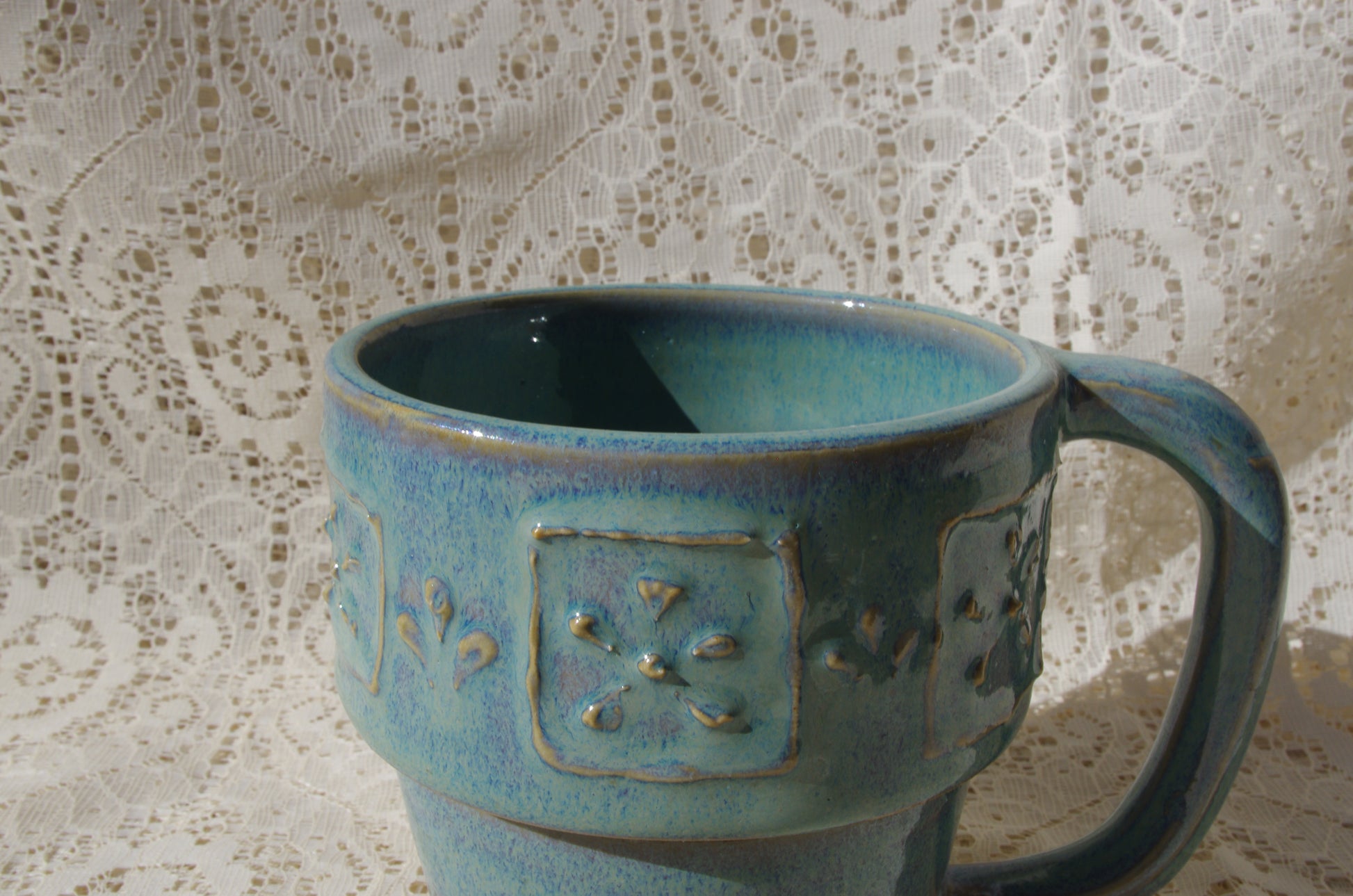 Teal mug with slip trailed flowers.