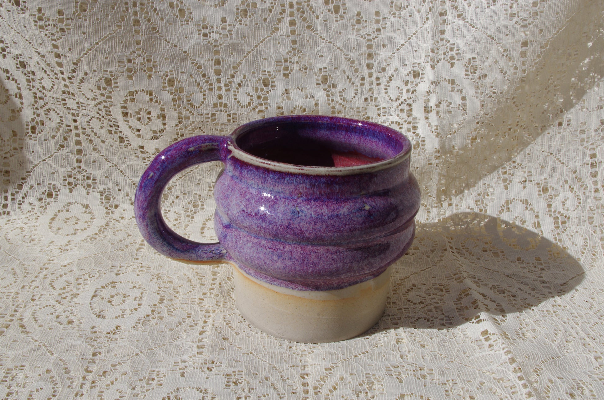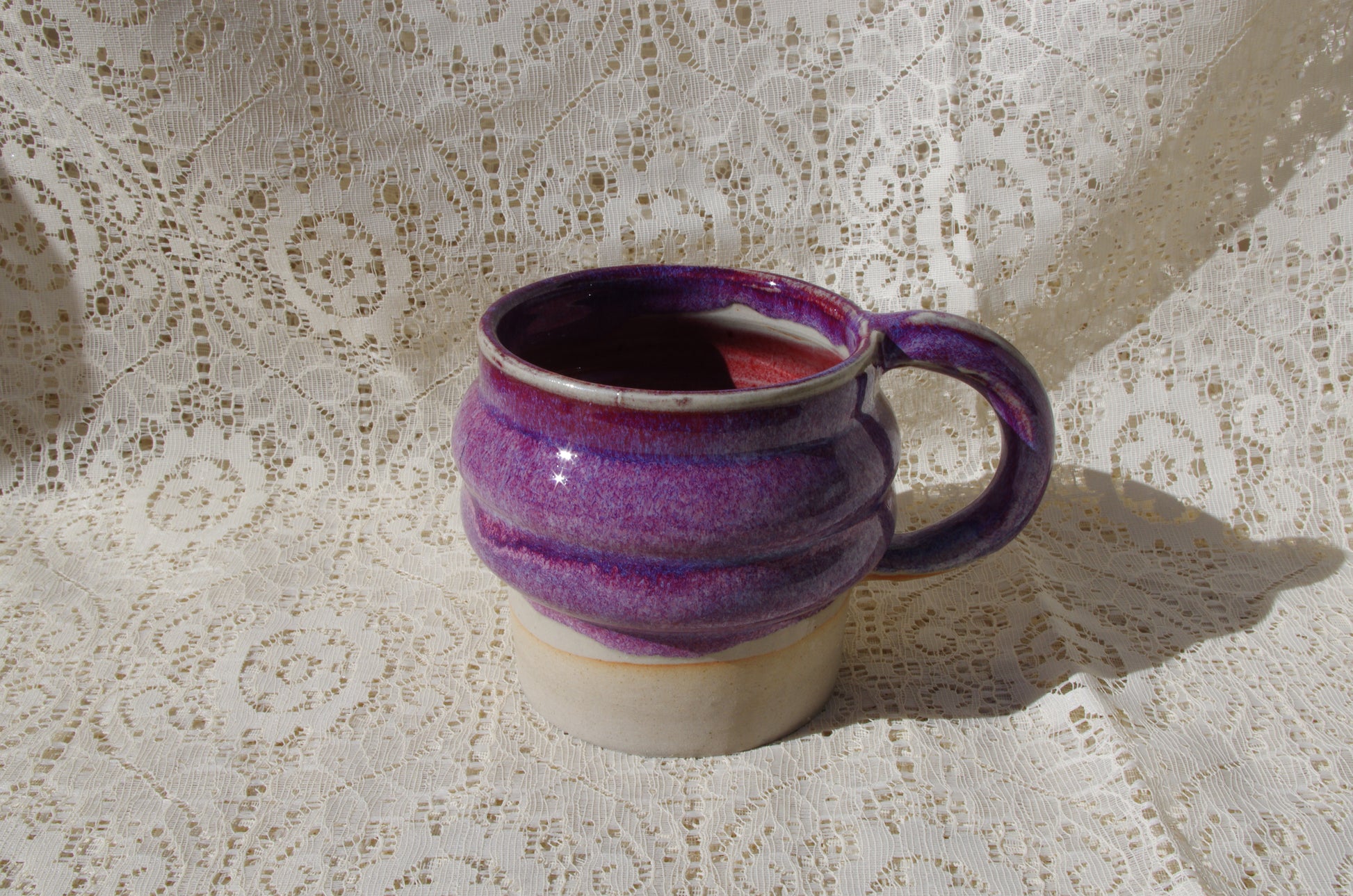 Purple mug with variants of magenta and blues. Red on the interior.