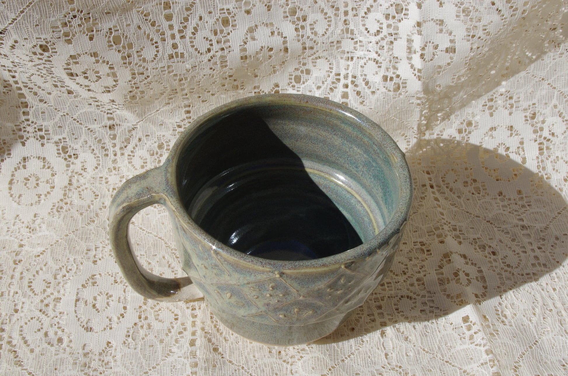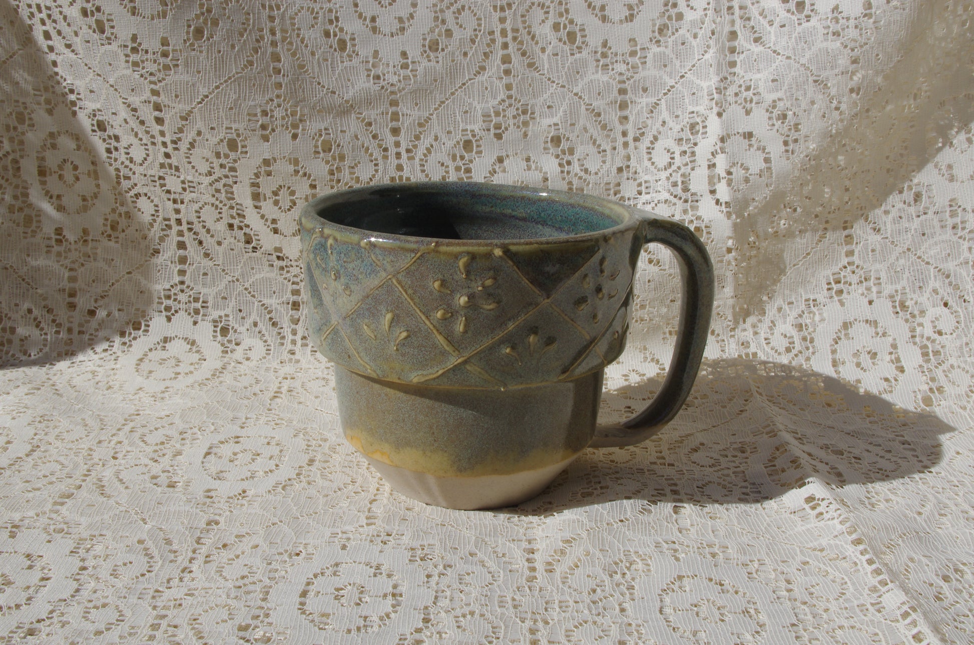 Olive green mug with subtle blues and browns. Decorated with slip trailed flowers.